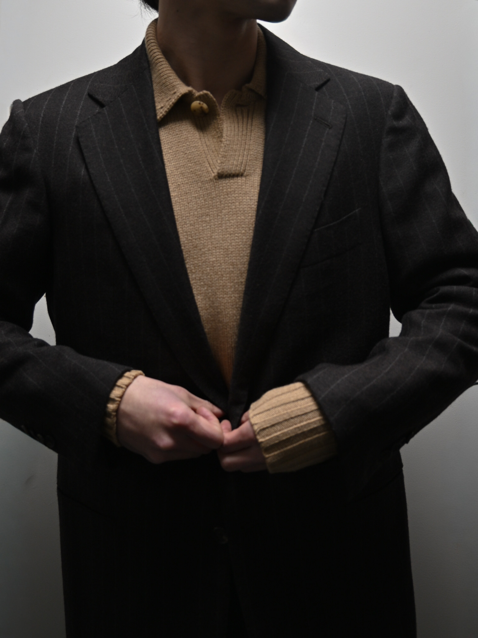ワンボタンのデザインに目が行きがちですが、実はこのやや大きめに設計された襟も、大きな魅力のひとつです。主張しすぎることはありませんが、着用した際に自然と存在感があり、全体のバランスを整えてくれます。 ボタンを大胆に開け、襟を立てるようにしてアウターの中に重ねるスタイルもおすすめで、首元に程よいボリュームと変化が生まれ、いつもの着こなしにさりげないアクセントを加えてくれますし、出番の多いアウターの気分を変えたいときのアレンジとしても取り入れやすいかなと思います。