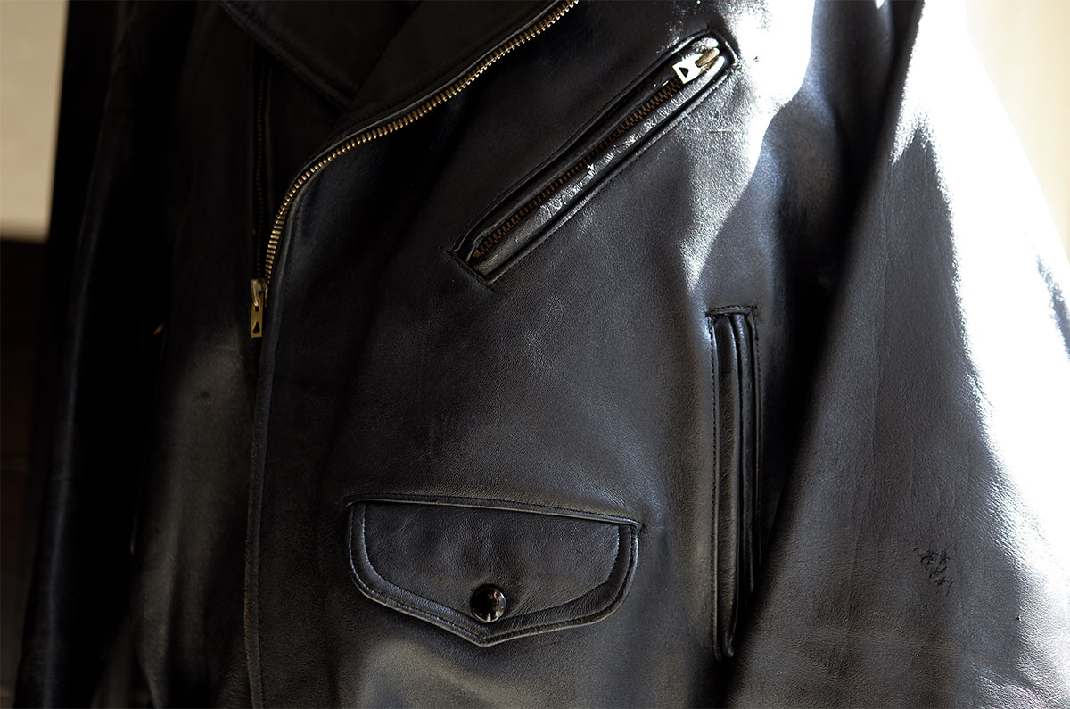 だから探していないと言ったら変な言い方になってしまうのですが、そうなんです。だからこそ出逢える時は出逢えるので、この50年代フランスのダブルブレストのバイカージャケットは驚きました。文化としても世界規模で芽吹いたばかりの時代におけるバイカープロダクトで良い意味で普遍的なスタイルながらしっかりと濃密にFrench、こんな個体見たことがありませんし50s USや50s UKは想像したことも遭遇したこともありますが50s Frenchの存在は想像も遭遇も皆無でした。しっかりとバイカーですべからく男らしいのですがポケットの意匠性やシルエットバランスがやはり“さすがモードの本国”な洗練性で、ウエストベルトも切れていないしリアルファーの着脱式付け襟もリアルムートンの着脱式ライニングベストも完備と、もう最高過ぎる。コンディションはヴィンテージの風格ながら十分に綺麗で、やはり革質には圧倒されます。正面から素直にフラットに向き合って楽しみたいオリジンヴィンテージの真髄が詰まりまくりです。